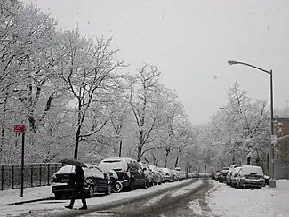 Like many New York City neighborhoods, the boundaries of Hudson Heights are imprecise.[notes 1] One definition has it bounded by the Hudson River to the west, Broadway to the east, 173rd Street to the south, and Fort Tryon Park to the north,[5][6][7][8] but another would limit the neighborhood to the top of the high ridge which physically separates it from the rest of Washington Heights. By this definition, Hudson Heights is bounded in the west by the Henry Hudson Parkway, in the east by Fort Washington Avenue, in the south by West 181st Street and in the north by Fort Tryon Park.[4] The ridge the neighborhood sits on overlooks the river to the west and the Broadway valley to the east. In 2018, The New York Times defined it as being bordered by 173rd Street in the south, Bennett Avenue in the east, the northern boundary of Fort Tryon Park in the north, and the Hudson River in the west.[9]