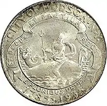 The Hudson, New York, Sesquicentennial half dollar, sometimes called the Hudson Sesquicentennial half dollar, is a commemorative fifty-cent piece struck by the United States Bureau of the Mint in 1935. The coin was designed by Chester Beach. Its obverse depicts the Half Moon, flagship of Henry Hudson, after whom the city of Hudson, New York is named. In addition to showing the ship, the coin displays a version of the Hudson city seal, with Neptune riding a whale, a design that has drawn commentary over the years.