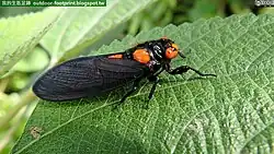 - ↑ Tzi Ming Leong and Ali bin Ibrahim OVIPOSITION BY THE BLACK AND SCARLET CICADA, HUECHYS SANGUINEA (DE GEER, 1773) IN SINGAPORE