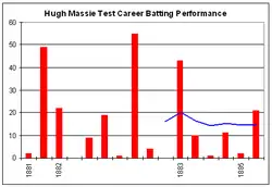 Massie's role in the 1882 Ashes Test at The Oval was almost as pivotal in deciding the result as Fred Spofforth's celebrated performance with the ball.[2] With Alick Bannerman as his opening partner, the hard-hitting Massie scored 55 in 57 minutes from just sixty deliveries, with nine fours, to give the Australians a chance.[3] They duly took the match to win by seven runs.