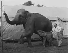 During the 1930's Hugo Schmitt went several times to India, in order to select elephants to import to Europe, and he married Jenny, from the island Sylt, part of Nordfriesland district, Schleswig-Holstein in north Germany. During this time, unemployment accelerated in Germany and the circus faced such economy problems, that groups of animals, including elephants, were sold to Circus Sarrasani. But a highlight was a successful elephant breeding, when Minjak, although conceived in Leipzig Zoo, was born in January 1932 in Germany. While Schmitt claimed she was born in a Zoo in Essen, the author Gerhard Zapf writes that she was born in the circus elephant tent while on tour in Essen.[3] Lorenz Hagebeck state she was born in the Hagenbeck Zoo in Stellingen, and some even claim she was born in Leipzig Zoo.[4]