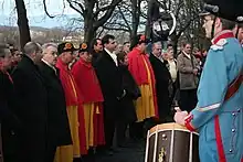 Swiss huissiers in their official capacities wear ceremonial robes with the heraldic colours of the entity they represent, Bundesweibel in red and white, cantonal Weibel in cantonal colours (Standesfarben).