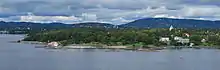 Huk as seen from the Oslofjord. Naturist beach left, the main beach and the new beach to the right