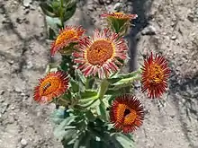 The leafy inflorescence produces many flower heads also completely covered in small glandular hairs. The green, lance-shaped phyllaries are over a centimeter (0.4 inch) long. The center of the flower head is filled with many yellow disc florets, while the edge is fringed with 28–75 narrow, thready red-orange to reddish pink ray florets each up to a centimeter (0.4 inches) long.