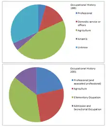 The first census was created in 1801 which only had 4 types of occupations listed.[10] In 1841 over 3,000 different occupational titles were listed (a vast change from 1801) this created a very long and confusing table. By 1881 a more organised classification was used in the county, which covered 414 categories of occupation.[10] The graph shows 4 main occupations that were popular in 1881; 'Agriculture','Domestic service or offices', 'Professional', 'Animals' and 'Unknown'. Obviously agriculture would be the most active occupation due to the time period and land being fertile with the close proximity to the river Ure. Unfortunately, because of the need to reorganise these statistics into different areas, for 1971 to 1991 the data collected covered over 10,000 wards, and only a very simple industrial classification is available for these, therefore some data is missing.[11] Comparing this to the 2001 occupational history graph you can see that there was a change in popularity of occupations. Ellementory occupation became the most active population e.g. washing windows and other glass surfaces of buildings and delivering messages or goods.