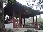 A square pavilion open on two sides, sited atop a hill in front of the Fragrant Sorghum Hall. |
