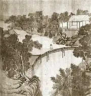 In 1513, Wang Xianchen, an Imperial Envoy and poet of the Ming dynasty, created a garden on the site of the dilapidated Dahong Temple which had been burnt during the Ming conquest. In 1510, he retired to his native home of Suzhou on the occasion of his father's death. He had experienced a tumultuous official life punctuated by various demotions and promotions, and gave up his last official post as magistrate of Yongjia county in Zhejiang province, and began to work on the garden.[3] This garden, meant to express his fine taste, received close attention from the renowned artist, Suzhou native, and friend, Wen Zhengming. The garden was named (first evidence around 1517[3]) after a verse by the famous scholar official of the Jin dynasty, Pan Yue, in his prose, An Idle Life, "I enjoy a carefree life by planting trees and building my own house...I irrigate my garden and grow vegetables for me to eat...such a life suits a retired official like me well".[4] This verse symbolized Wang's desire to retire from politics and adopt a hermit's life in the manner of Tao Yuanming. In the Xianju rhyme-prose, he writes 'This is the way of ruling for an unsuccessful politician'.[3] It took 16 years until 1526 to complete. Wen Zhengming wrote an essay Notes of Wang's Humble Administrator's Garden, and painted Landscapes of the Humble Administrator's Garden in 1533 including 31 paintings and poems to commemorate the garden.[4] Wen produced a second album of eight leaves showing sites in the garden in 1551, with different views but the same poems as in 1533.[3]