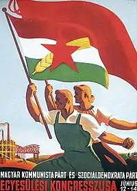It was formed by a merger of the Hungarian Communist Party (MKP) and the Social Democratic Party of Hungary (MSZDP).[1] Ostensibly a union of equals, the merger had actually occurred as a result of massive pressure brought to bear on the Social Democrats by both the Hungarian Communists, as well as the Soviet Union. The few independent-minded Social Democrats who had not been sidelined by Communist salami tactics were pushed out in short order after the merger, leaving the party as essentially the MKP under a new name. Its leader was Mátyás Rákosi until 1956, then Ernő Gerő in the same year for three months, and eventually János Kádár until the party's dissolution. Other minor legal Hungarian political parties were allowed to continue as independent coalition parties until late 1949 but were completely subservient to the MDP.