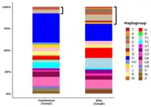 A comprehensive archaeogenetic study published in Scientific Reports in September 2016 examined mtDNA of 76 Hungarian-conquest period samples, and "West-Eurasian haplogroups (H, HV, I, J, K, N1a, R, T, U, V, X, W) were present at a frequency of 77%, and Central and East-Eurasian haplogroups (A, B, C, D, F, G, M) at 23%". In conclusion, "both the linguistically recorded Finno-Ugric roots and historically documented Turkic and Central Asian influxes had possible genetic imprints in the conquerors' genetic composition".[295] In the same year, Molecular Genetics and Genomics was published, a study of 17 samples of first generation Hungarian conqueror cemeteries, revealing that "the most frequent [mtDNA] Hg was B, which together with Hg A indicate that about 30% of the Karos population is genetically connected to Central and East Asia. The majority of Hg-s (H, U, T, J, X) are of Eurasian origin, however, it is remarkable that two individuals belong to subhaplogroup H6, which may also indicate Asian connection ... The single X2f maternal haplotype of the chief (sample 11) is of particular interest, as this haplotype is most probably of south Caucasian origin...", while only four had a Y-DNA Hg (typical European 2x I2a and R1b).[296] A genetic study published in PLOS One in October 2018 examined the mtDNA of individuals from 10th-century graves associated with the Hungarian conquerors of the Basin. The majority of their maternal lineages were traced back to the Potapovka, Srubnaya and Poltavka cultures of the Pontic–Caspian steppe, while one-third of their maternal lineages could be traced back to Inner Asia, probably being derived from Asian Scythians and the Xiongnu (Asian Huns). The mtDNA of the conquerors was found to be most closely related to the Onoğur-Bulgar ancestors of the Volga Tatars. The conquerors did not display significant genetic relations to other Finno-Ugric peoples. The evidence implied that the conquerors did not contribute significantly to the gene pool of modern Hungarians.[297] A 2021 study analyzed maternal lineages from 202 10-11th century commoners from Carpathian Basin and compared them to conqueror elite, finding that "the haplogroup composition of the commoner population markedly differs from that of the elite, and, in contrast to the elite, commoners cluster with European populations. Alongside this, detectable sub-haplogroup sharing indicates admixture between the elite and the commoners. The majority of the 10–11th century commoners most likely represent local populations of the Carpathian Basin, which admixed with the eastern immigrant groups (which included conquering Hungarians)".[298]