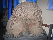 The oldest of the two runestones depicts a large man dressed in a long coat and a pointed helmet. The man, who carries an axe on his right shoulder, is possibly a member of the Varangian Guard.