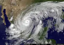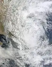 Upon becoming a hurricane, Alex was located in a moist, low shear environment, which led to steady intensification on June 30. The pressure continued to fall—a sign of an intensifying cyclone—with a more rapid drop occurring that afternoon and evening.[24] The hurricane strengthened into a Category 2 storm late on June 30, as it approached the northeastern Mexican coast. At 02:00 UTC on July 1, Alex made landfall at peak strength, with maximum sustained winds of 110 mph (180 km/h) and an unusually low central pressure of 946 millibars (27.9 inHg) in the municipality of Soto la Marina in the Mexican state of Tamaulipas.[3][25] Operationally, the National Hurricane Center had the landfall intensity estimate as 105 mph (169 km/h), gusts of 125 mph (201 km/h) and a of 947 millibars (28.0 inHg) when it struck the Mexican coast.[26][27] Several hours after moving ashore, the storm weakened to Category 1 status,[28] and its structure began to deteriorate. However, deep convection persisted around the center.[29] By 12:00 UTC, Alex had weakened into a tropical storm;[30] by 00:00 UTC July 2, the Sierra Madre Oriental disrupted Alex's core, causing the storm to weaken into a tropical depression. Soon afterward, the storm's low-level circulation center dissipated over San Luis Potosí.[3] However, the interaction with the mountain range caused orographic lift on the eastern side of the storm after the low-level circulation center had ceased to exist, producing torrential rainfall throughout northern and central Mexico.[26][31] Following the dissipation of Alex, divergence at the 200 mb atmospheric pressure level (approximately at 10 km (6.2 mi) of altitude), a ridge of high pressure located over southern Texas, and Alex's residual moisture interacted to produce intense convection over Nuevo León, Tamaulipas and Coahuila for the next 72 hours.[26] Alex's mid-level circulation persisted for another several days, with the remnants turning northeastward and slowly moving towards Texas. On July 6, Alex's remnants dissipated near the border of southwestern Texas.[1]