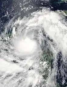 In Chiapas, one person from Guatemala died and four others were injured when their bus rolled over as it traveled over a damaged highway.[38] The state's civil defense system reported that 984 families from 17 municipalities were evacuated to shelters, and that Alex's torrential rainfall also produced 23 landslides in six counties of the state.[58][63] On June 30, a mudslide knocked down a tree onto a 115-kV transmission line near El Vergel, causing 82 cities and towns in the municipalities of Villaflores and Villa Corzo to lose power; 32,000 residents were left without electricity from this outage alone. Power was restored the same evening.[64] In Yucatán, a boat carrying seven passengers capsized; all were eventually rescued.[63] In Campeche, 937 dwellings suffered minor damage as a result of the storm.[58]