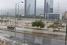 The storm's most significant effect in Northeastern Mexico was excessive rainfall, which was reported throughout the region. In Tamaulipas, between 3.829 to 12.421 in (97.25 to 315.5 mm) of precipitation were reported at weather stations statewide.[66] In Nuevo León, an average of 9.5 in (242 mm) of rain was reported statewide up to July 1.[67] The pluviometer at Estanzuela reported that a total of 35 in (890 mm) of rainfall were recorded;[68] in Arroyo Seco, in San Pedro Garza García, a total of 23.1 in (588 mm) of precipitation was recorded between June 29 and 6 a.m. on July 1. Other rainfall stations in Monterrey recorded between 14.163 and 24.370 in (359.75 and 619 mm) of rain, while Santa Catarina recorded 23.297 in (591.75 mm) of precipitation.[69] The Comisión Nacional del Agua (CNA) noted that the storm rainfall totals greatly exceed the totals produced by Hurricane Gilbert in 1988, which only produced 11 in (280 mm) of rain in the city.[66]