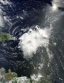 Within hours of Bertha's designation on August 1, wind shear stemming from a trough over the central Atlantic displaced convection from the circulation center.[1][9] Satellite imagery depicted a well-defined and vigorous circulation; however, observations from the hurricane hunters indicated a wind field more akin to a tropical wave.[10] Around 21:00 UTC, Bertha clipped the northern end of Martinique with sustained winds of 50 mph (80 km/h).[11] Persistent shear continued to take its toll on the cyclone as it entered the Caribbean Sea with aircraft data indicating no closed circulation at 5,000 ft (1,500 m) elevation. Despite this, observations from Martinique and Dominica indicated that there was some semblance of a surface circulation, and the NHC continued to monitor Bertha as a tropical storm.[12] Throughout August 2, convection steadily increased in coverage and organization though the center of Bertha remained displaced from the strongest thunderstorms to the southwest. NEXRAD weather radar imagery from San Juan, Puerto Rico depicted a disorganized, possibly open circulation throughout the day. In light of this, NHC forecaster John Beven noted that the system could degenerate into an open wave around the time in reached Hispaniola later on August 2.[13]