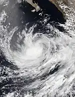 On June 7, the National Hurricane Center (NHC) began tracking a disturbance with potential for potential tropical development south of the Gulf of Tehuantepec.[3] Late on June 10, a broad low-pressure area formed off the coast of southwestern Mexico, producing disorganized showers and thunderstorms in an environment conducive for gradual development.[4] By 09:00 UTC on June 14, the low had become a tropical depression while it was situated about 395 mi (636 km) south-southeast of Manzanillo, Colima.[5] Six hours later, the depression strengthened into a tropical storm, and was assigned the name Blas.[6] The storm's convective organization continued to improve through the day according to satellite imagery,[7] maintaining a well-defined structure and developing prominent convective banding features,[8] as a circular central dense overcast overcast became embedded on the system.[9] On June 15, Blas began to rapidly intensify as it developed an inner core, and at 15:00 UTC that day, it became a Category 1 hurricane on the Saffir–Simpson scale.[10] Blas then developed a mid-level eye on the western portions of the cyclone,[11] then maintained its intensity due to very cold cloud tops near the center and a strong upper-level outflow in three of the storm's quadrants.[12]