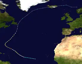 The storm then weakened as it turned northward and eventually northeastward on August 21.[7][2] Gradually losing strength, Debbie passed well to the southeast of Bermuda,[1] although it is believed that if not for the presence of nearby Hurricane Camille, which emerged into the Atlantic from the United States on August 20, Debbie would have likely ended up further west, closer to the island.[5] Debbie mostly maintained its severity through 06:00 UTC on August 23 as it continued generally toward the northeast.[1] By 12:00 UTC on August 23, Debbie weakened to below Category 2 status and turned northward, becoming extratropical six hours later, while still retaining winds of hurricane force.[1][2] The next day, the storm's remnants—no longer bearing winds of hurricane intensity, but only gale force—skirted the southeastern tip of Newfoundland.[8] The remnants of Debbie began to lose definition as they accelerated northeastward,[9] while moving over increasingly cold waters. Debbie's remnants finally dissipated west of Norway on August 27.[5][1][2]