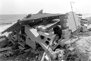 With its location close to the storm's center, Dauphin Island saw the greatest damage in Alabama. Access to the island was shut down during and immediately after the hurricane, slowing the progression of damage assessments.[88] Additionally, the storm cut power and phone services.[89] Post-storm surveys revealed discernible patterns in structural damage on the island; these included a nearly complete lack of destruction on the heavily wooded eastern end, and damage concentrated closer to the western side and along areas exposed to strong easterly winds.[90] First-hand accounts relayed that in the most severe cases, entire elevated homes were torn from their pilings and swept into the Gulf of Mexico.[91] The number of homes demolished in that manner was informally placed at 50,[92] though such total building collapses were typically confined to poorly secured buildings.[90] In total, the hurricane destroyed 190 residences on Dauphin Island, accounting for nearly 25% of all homes, and a further 235 sustained substantial damage.[92] An unofficial and early estimate of losses on the island was $30 million.[86]