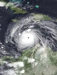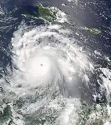 Tracking through an area of extremely low wind shear and increasingly high oceanic heat content, Felix quickly developed a well-defined eye, a symmetric cloud structure, and strong upper-level outflow;[15] consequently, the hurricane commenced explosive intensification shortly afterward. Felix attained major hurricane status at around 1800 UTC on September 2 while located about 490 mi (790 km) southeast of Kingston, Jamaica.[16] Rapid strengthening continued, and later that day the hurricane attained Category 4 status on the Saffir-Simpson Hurricane Scale with the pressure dropping to 957 mbar (957 hPa; 28.3 inHg); this corresponded to a falling rate of 3.4 mbar (3.4 hPa; 0.10 inHg) per hour, which the National Hurricane Center described as "one of the more rapid deepening rates we have observed." A Hurricane Hunters flight reported a stadium effect in the eye, and also reported the eye diameter shrank to 14 mi (23 km).[17] A subsequent Hurricane Hunters flight experienced flight level winds of 175 mph (282 km/h), with peak surface winds of 163 mph (262 km/h) reported in the southwest quadrant of the eyewall; surface winds of 189 mph (304 km/h) were found in its northeastern quadrant, although the National Hurricane Center reported the peak reading could have been contaminated due to graupel in the clouds. Based on the observations, it is estimated Felix attained winds of 175 mph (282 km/h) by 0000 UTC on September 3 while located about 390 mi (630 km) southeast of Kingston, Jamaica, making Felix a Category 5 hurricane on the Saffir-Simpson Hurricane Scale. This also makes Felix the second-fastest intensifying Atlantic hurricane on record, just behind Wilma 2 years prior.[1] While investigating the hurricane, Hurricane Hunters encountered extreme turbulence and potentially dangerous graupel, which forced the flight to abort the mission.[18]