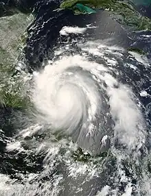 Continuing quickly westward, the diameter of the eye decreased to 12 mi (19 km),[19] and the National Hurricane Center estimates the hurricane attained a minimum central pressure of 929 mbar (929 hPa; 27.4 inHg) about seven hours after it reached Category 5 status.[1] Initially, Felix was predicted to track west-northwestward, striking Belize before crossing the Yucatán Peninsula;[19] however, its path remained nearly due westward. Subsequently, cloud tops near the center started to warm as the eye became less distinct,[20] and by 1800 UTC on September 3, Felix weakened to Category 4 status with winds of 145 mph (233 km/h).[21] On September 4, Felix had completed an eyewall replacement cycle and began strengthening again during the day.[22] Felix was upgraded to a Category 5 for the second time at 1040 UTC,[23] and made landfall in Nicaragua just south of its border with Honduras, in the Mosquito Coast region, as a Category 5 hurricane with 160 mph (260 km/h) winds.[24] Hurricane Felix struck Nicaragua on the same day as Hurricane Henriette struck the Baja California Peninsula in the eastern Pacific Ocean, which marked the second recorded occurrence that a North Atlantic hurricane and a Pacific hurricane made landfall on the same day;[25] the previous occurrence was on August 23, 1992, when Hurricane Andrew hit the Bahamas on the same day Hurricane Lester hit Mexico's Baja California Peninsula. By nine hours after moving ashore, the system maintained a well-organized cloud pattern and intense rainbands, although the winds rapidly decreased;[26] early on September 5 Felix weakened to a tropical storm as its upper-level circulation became detached from the low-level portion.[27] The system deteriorated to a tropical depression as it crossed into southern Honduras, and at 0900 UTC the National Hurricane Center issued the last advisory on Felix as it began degenerating into a broad low pressure area.[28] The remnants of Felix tracked west-northwestward over other portions of Latin America, and eventually dissipated over the Mexican state of Tabasco on September 7.[1]