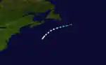 A hurricane was discovered located roughly halfway between Bermuda and Nova Scotia on September 9. The hurricane did not strengthen and began to gradually weaken as it moved to the south of Newfoundland. It weakened to a tropical storm and later became extratropical on September 11.[4]