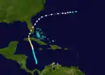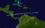 The RMS Nile first observed a tropical storm east of Martinique on September 29.[2] By early on October 1, the storm strengthened into a hurricane as it passed near the Netherlands Antilles. It later peaked as a Category 2 hurricane before making landfall just south of Bluefields, Nicaragua, late on October 3. The system weakened to a tropical storm early on the next day, but remained a tropical cyclone due to crossing relatively flat terrain. Several hours later, the storm reached the Pacific Ocean, but dissipated on October 5.[4]