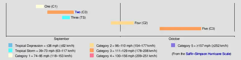 The Atlantic hurricane database (HURDAT) officially recognizes five tropical cyclones for the 1876 season. Four storms attained hurricane status, with winds of 75 mph (119 km/h) or greater. The second and fourth hurricanes of the season were the most intense, with maximum sustained winds up to 120 mph (165 km/h). The first storm of the season was a hurricane that existed for two days in September off the east coast of the United States. Hurricane Two, known as the San Felipe hurricane, was the most notable storm of the season. It formed near the Windward Islands on September 12 and hit Puerto Rico as a Category 3 hurricane before crossing Hispaniola and Cuba. It continued northward to make landfall in North Carolina and continued through the interior of the United States as far as Cape Cod. It caused extensive damage in both Puerto Rico and North Carolina. The third cyclone of 1876 was a tropical storm, known to have existed for two days in the mid-Atlantic. The next cyclone, Hurricane Four, crossed from the Atlantic to the Pacific, passing over Nicaragua in late September and early October. The final storm of 1876 developed north of Panama and proceeded north across Cuba and Florida before dissipating on October 23.[4]