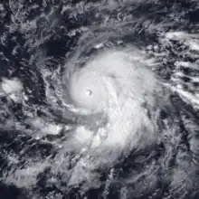 On July 24, the storm crossed 140°W, entering the Central Pacific Hurricane Center's (CPHC) area of responsibility.[1][7] Upon entering the region, Gilma became the fourth consecutive cyclone to move into the CPHC region.[6][8] Several hours later, Gilma attained its peak intensity as a Category 5 hurricane with winds of 160 mph (255 km/h) and a barometric pressure estimated at 920 mbar (hPa; 27.17 inHg).[8] After maintaining this intensity for roughly 12 hours, the storm abruptly weakened. Within a few hours, maximum winds decreased by 45 mph (70 km/h) to 115 mph (185 km/h), a low-end Category 3 hurricane.[7] The reason for the sudden weakening is unknown; although the tropical upper tropospheric trough originally located over the storm, providing it with a favorable anticyclonic flow, shifted westward to the International Date Line. Additionally, the storm's eye became obscured by cirrus clouds.[9]