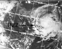 ![]() Hurricane Inez seen from space near the Yucatán Peninsula on October 9, 1966 | |