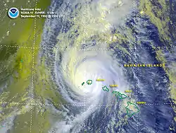 ![]() Hurricane Iniki at peak intensity south of Kauaʻi on September 11 | |