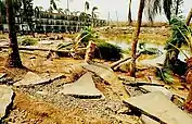 Among those on Kauaʻi was filmmaker Steven Spielberg, who was preparing for the final day of on-location shooting of the film Jurassic Park. He and the 130 of his cast and crew remained safely in a hotel during Iniki's passage.[25][26] According to Spielberg, "every single structure was in shambles; roofs and walls were torn away; telephone poles and trees were down as far as the eye could see." Spielberg included footage of Iniki battering the Kaua'i coastal walls as part of the completed film, where a tropical storm makes up a pivotal part of the plot. Members of the film's crew helped to clear some of the debris off of nearby roads.[25]