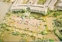 East of the hurricane's landfall, Oʻahu received tropical storm-force winds during Iniki's passage along its southwestern coast, with an island-wide peak gust of 82 mph (132 km/h) in Waianae. The outer rainbands of the hurricane spawned an F1 tornado in Nānākuli, also on Oʻahu. Along western Oahu, Iniki produced a 2 to 4 ft (0.61 to 1.22 m) surge, with 17 ft (5.2 m) waves recorded near Mākaha.[4] Prolonged periods of high waves severely eroded and damaged the southwestern coast of Oʻahu, with the areas most affected being Barbers Point through Kaʻena.[1] The Waiʻanae coastline experienced the most damage, with waves and storm surge flooding the second floor of beachside apartments.[27] In all, Hurricane Iniki caused several million dollars in property damage,[5] and two deaths on Oʻahu.[1]