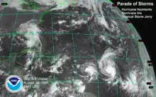 On August 28, Iris moved away from the Lesser Antilles, and at 1800 UTC re-attained hurricane status as it began a steady motion to the north-northwest.[1] By that time, there was uncertainty in its future track due to the possible interactions among Iris, Humberto to the northeast, Tropical Storm Karen to the southeast, and the remnants of Tropical Storm Jerry to the west.[9] In addition, after Tropical Storm Luis formed on August 27, there were four active tropical cyclones in the Atlantic.[10] A few days later, there were three simultaneous hurricanes, which is a rare event, when Luis attained hurricane status.[11] On August 30, Iris turned to the northeast while it began interacting directly with Tropical Storm Karen. Over the next few days, the smaller tropical storm moved around the larger circulation of Iris, potentially causing the hurricane to move erratically.[1] Iris' intensity did not change significantly during that time, and it maintained strong outflow but a weak eyewall. An eastward-moving trough bypassed the storm to the north, causing the motion to become nearly stationary.[12] A building ridge to the northeast caused Iris to turn to a northwest drift on September 1. By that time, the eye had become distinct and well-organized,[13] and at 0600 UTC that day, Iris attained peak winds of 110 mph (175 km/h) to the southeast of Bermuda.[1]
