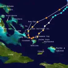 Strengthening of the mid-level ridge prompted a sudden shift in Joaquin's trajectory to the southwest, directing it towards the Bahamas.[13][15] Forecasters at the NHC noted considerable uncertainty in the future of Joaquin, with forecast models depicting a wide range of possibilities.[16] Throughout September 29, the storm steadily intensified as its circulation became embedded within deep convection and upper-level outflow became increasingly prominent.[17] High sea surface temperatures and decreasing shear aided strengthening, and early on September 30, the storm achieved hurricane status.[18][19] Rapid intensification ensued thereafter, with an eye developing within a symmetric central dense overcast. Data from aircraft reconnaissance indicated that Joaquin reached Category 3 status on the Saffir–Simpson hurricane wind scale by 03:00 UTC on October 1.[20] Around 12:00 UTC the eye of Joaquin passed over Samana Cay, Bahamas, with winds of 130 mph (215 km/h), making it a Category 4 hurricane.[21] Around this same time, its eye contracted from 41 to 27 mi (66 to 43 km) in diameter, representing significant intensification.[22][23] At this time Joaquin was located just 15 mi (25 km) northwest of Crooked Island.[24] The storm's central pressure bottomed out at 931 mbar (hPa; 27.49 inHg) around 00:00 UTC on October 2.[25]