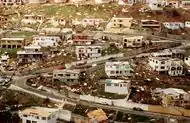 The highest reported gusts were 129 mph (208 km/h) in a Noncommissioned Automated Surface Observing System and 95 mph (153 km/h) gusts in Sailboat Puffin at Green Cay. The highest sustained winds were 105 mph (169 km/h) in a Noncommissioned Automated Surface Observing System.[3] Marilyn was directly responsible for seven deaths, most due to drowning on boats or offshore. Ten thousand people were left homeless on St. Thomas, and most buildings sustained some damage.[3]