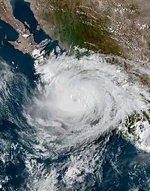 The depression's inner-core convection was disheveled for a while after formation, but the cyclone organized and became better defined throughout September 8, as it drifted northward within weak steering currents.[1][2] At 12:00 UTC on the same day, the cyclone strengthened into a tropical storm and was given the name Olaf.[3] Turning northwestward at a slow pace, Olaf developed banding features and good outflow within very favorable environmental conditions for intensification, featuring warm sea-surface temperatures (SSTs) and low amounts of vertical wind shear.[4] On September 9, the storm developed a well-defined eye and rapidly intensified into a Category 1 hurricane around 12:00 UTC.[1][5] Olaf intensified at an even quicker rate as it neared to southwestern coast of the Baja California Peninsula, developing a symmetrical eyewall as its winds increased by 20 mph in just six hours.[6] At 02:50 UTC on September 10, Olaf reached peak intensity with maximum sustained winds of 105 mph (169 km/h) and a minimum barometric pressure of 968 millibars (28.6 inHg); the storm made landfall very near San José del Cabo at this time.[7][8]