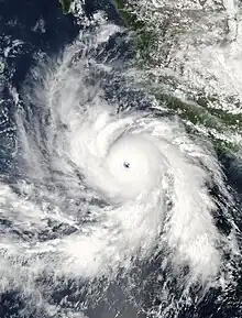 ![]() Hurricane Rick near peak intensity south of Mexico, on October 17 | |