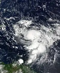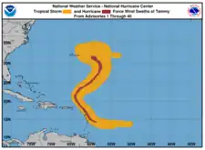 On October 11, the National Hurricane Center (NHC) began monitoring a tropical wave located wave just offshore of West Africa.[1] Showers and thunderstorms associated with the disturbance became more concentrated and better organized on October 14,[2] but nearby dry air managed to infiltrate the system, suppressing convection to some degree.[3] Later, when environmental conditions became more conducive, thunderstorm activity within the disturbance was able to become more organized on October 17.[4] The following afternoon, satellite imagery indicated a well-defined low-level surface circulation, prompting the NHC to designate the system as Tropical Storm Tammy.[5] Despite having a sheared appearance due to light to moderate westerly vertical wind shear, hurricane hunter data indicated that Tammy was strengthening as it moved quickly westward through record-warm sea surface temperatures towards the Leeward Islands on October 19.[6][7]