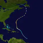 Data from ships and nearby Windward Islands indicate that a tropical depression formed approximately 275 mi (445 km) southeast of Barbados around 06:00 UTC on August 16.[2][8] The depression tracked north-northwestward and intensified into a tropical storm around 00:00 UTC on August 18, while situated between the islands of Antigua and Barbuda. Continuing north-northwestward, the cyclone intensified into a hurricane while north of the Lesser Antilles at 00:00 UTC on August 19. Curving west-northwest, the storm gradually intensified into a Category 2 hurricane the following day. On August 20, the system began to curve northward and later north-northeastward. The cyclone peaked with winds of 130 mph (215 km/h) on August 22, but weakened to a minimal Category 3 hurricane with winds of 115 mph (195 km/h) by the time it passed just west of Bermuda later that day. On August 24, the storm weakened to a Category 2 hurricane and began to turn more northward. Continuing to curve northwestward on August 25, the system continued to weaken to a Category 1 hurricane, later striking Newfoundland as an extratropical cyclone on August 26. The storm dissipated later that day.[8]