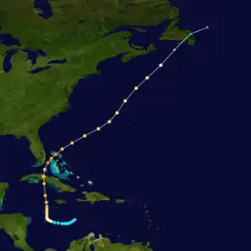 A tropical storm of extratropical origins formed about 220 mi (355 km) east of Bermuda around 06:00 UTC on October 30.[38][8] The storm steadily intensified and moved west-northwestward, passing about 55 mi (90 km) north of Bermuda early on October 31. After reaching hurricane intensity around 12:00 UTC on the next day, the cyclone curved west-southwestward. The system then turned south-southwestward by early on November 3, around the time that it reached Category 2 strength. Peaking with winds of 105 mph (165 km/h) and a minimum pressure of 964 mbar (28.5 inHg) shortly thereafter, the storm curved southwestward later that day while approaching the Bahamas. Just after 00:00 UTC on November 4, the hurricane struck North Abaco at the same intensity. The cyclone then continued west-southwestward and made landfall in Miami-Dade County, Florida, near present-day Bal Harbour around 18:00 UTC on November 4 with winds of 100 mph (155 km/h). The storm emerged into the Gulf of Mexico early the following day and weakened to a tropical storm around 00:00 UTC on November 6 while beginning to curve west-northwestward. Thereafter, the system decelerated and curved westward late on November 7, at which time it weakened to a tropical depression. By 12:00 UTC on November 8, the storm transitioned into an extratropical cyclone about 140 mi (230 km) west of St. Petersburg, Florida, and dissipated several hours later.[8]