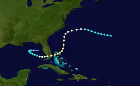 An area of disturbed weather developed into a tropical depression around 06:00 UTC on August 29 while situated roughly 200 mi (320 km) northeast of the Turks and Caicos Islands.[2][8] The depression initially strengthened slowly as it moved west-northwestward and then westward, reaching tropical storm intensity by early on August 31. Later that day and on the following day, the system passed through the Bahamas and reached hurricane intensity around 12:00 UTC on September 1. After passing near the south end of Andros Island, the storm rapidly intensified while moving across the Straits of Florida, achieving major hurricane status by 06:00 UTC on the next day. At approximately 00:00 UTC on September 3, the cyclone intensified into a Category 5 hurricane, with winds peaking at 185 mph (295 km/h).[8] Around that time, a weather station on Craig Key, Florida, observed a barometric pressure of 892 mbar (26.3 inHg), the lowest in relation to the storm.[2] About two hours later, the hurricane made landfall on Long Key at the same intensity. The storm made its final landfall on the sparsely populated Apalachee coast near Cedar Key on September 4 as a Category 2 hurricane. Turning northeast, the system weakened to a tropical storm over Georgia on September 5, but re-intensified into a hurricane on September 6 shortly after emerging into the Atlantic offshore Virginia. The storm transitioned into an extratropical cyclone later that day,[8] but persisted until being absorbed by another extratropical cyclone offshore southern Greenland on September 10.[2]
