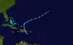 The origin of this hurricane is uncertain, though it is believed to have coalesced into a tropical depression over the central Caribbean Sea on September 23.[20] The disturbance gradually organized as it moved to the west, and strengthened to tropical storm intensity less than a day after formation and further to a hurricane by September 25. The cyclone subsequently curved northward from its initial westward motion. On September 27, the storm reached major hurricane intensity before making landfall near Cienfuegos, Cuba, as a Category 3 hurricane the next day.[8][20] After passing the island, the system reintensified and peaked with a minimum barometric pressure below 945 mbar (hPa; 27.91 inHg)[nb 3] and maximum sustained winds of 140 mph (220 km/h), making it a Category 4 hurricane. At the same time, the tropical cyclone passed over the Bahamian island of Bimini before moving out to sea. As it progressed northeastward, the hurricane gradually weakened before transitioning into an extratropical storm on October 2. The extratropical remnants traversed Newfoundland before dissipating later that day.[8][20]