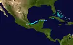 A tropical depression formed in the northwestern Caribbean on August 30. The system moved westward and soon made landfall in the Yucatán Peninsula near Playa del Carmen.[8] After emerging into the Bay of Campeche on the following day, the cyclone intensified into a tropical storm. By early on September 1, the system peaked with sustained winds of 60 mph (95 km/h). Around 18:00 UTC that day, the storm made landfall in the Mexican state of Veracruz to the southeast of the city of Veracruz.[8] After moving inland, the storm quickly weakened to a tropical depression early on September 2, before dissipating several hours later.[8] Authorities closed the Port of Veracruz.[19] A weather station in the city of Veracruz recorded sustained winds up to 67 mph (108 km/h).[2] Heavy rains generated by the system washed out train tracks, delaying railroad traffic.[19]