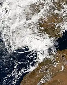 Hurricane Vince's impressive organization was very short lived as westerly wind shear began to erode the eye within hours.[5] In response, the storm weakened to a tropical storm shortly thereafter.[6] A broad low-level trough approached the storm from the northwest,[5] pulling the convection northward as the storm's low-level center accelerated eastward.[6][7] On 10 October, two brief bursts of convection surprised forecasters, but with the sea surface temperature as low as 22 °C (72 °F), the flares were not sustained.[8][9] Vince continued to weaken as it approached the Iberian Peninsula and became a tropical depression on 11 October, shortly before it made landfall near Huelva, Spain. The fast-moving tropical depression quickly dissipated over land.[1] Its remnants moved across southern Spain, dumping rain on the drought-ridden region, and moved into the Mediterranean Sea south of Alicante in the early hours of 12 October.[2]