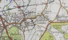 Husborne Crawley is a small village and civil parish in Bedfordshire, England, located close to Junction 13 of the M1 motorway. The village touches the borders of the Woburn Abbey estate on one side, and the village of Aspley Guise on the other. The meaning of the Husborne element of the towns name is "warrior stream" and the Crawley element means "crow clearing".[2] It appears as Hussheburn Crawele, in 1421.[3]