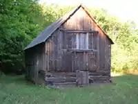 Hutzler's Barn is located in a clearing along with the Hutzler farmhouse and other outbuildings in various states of repair.[4] the barn is a 2+1⁄2-story frame, gable-roof swine barn, measuring 16 feet (4.9 m) by 30 feet (9.1 m),[4] sitting on 16-inch-square wooden beams.[2] The upper level was used to store hay, while the lower level was used to house pigs.[4] The walls are constructed from weathered wood with the front gable roof covered with tar paper. The interior of the barn is partitioned into three sections, each with its own entrance.