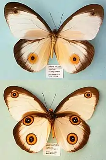 The species has three pairs of six well-developed ocellus on the ventral side of the wings: one pair on the forewings near the apex and two pairs on the hindwings.[2] Each eyespot is large and bordered with yellow, and the black "pupil" has plural small white dots inside.[2][4] This species is similar to Taenaris, but can be easily identified from that genus, which generally has only two or four ocellus with single white spot on its hindwings.[2]