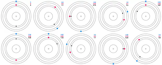 Hydra has an orbital period of approximately 38.2 days and is resonant with other moons of Pluto. Hydra is in a 2:3 orbital resonance with Nix, and a 6:11 resonance with Styx (the ratios represent numbers of orbits completed per unit time; the period ratios are the inverses).[5][34] As a result of this "Laplace-like" 3-body resonance, it has conjunctions with Styx and Nix in a 5:3 ratio.[34]