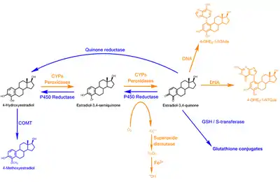4-OH-E2 shares the metabolic scheme of 2-OH-E2: methylation to 4-methoxyestradiol (4-meOE2), oxidation to quinones, or dehydrogenation to 4-OH-E1. Conjugation by the ubiquitously present COMT represents the most common extrahepatic pathway of 4-OH-E2 inactivation. However, if estrogen homeostasis is imbalanced by an increase in CYP1B1 and a decrease in COMT, a greater degree of genotoxic quinone formation from 4-OH-E2 will occur.[9] 4-OHE2 can be oxidized by microsomal CYPs or peroxidases to yield estradiol-3,4-semiquinone.[10] This semiquinone can undergo redox cycling with oxygen to form estradiol-3,4-quinone (E2-3,4-Q) and superoxide. E2-3,4-Q can be converted back to 4-OHE2 in a single step by quinone reductase, or in two sequential steps catalysed by P450 reductase via the semiquinone intermediate. GSH / S-transferase activity can abrogate E2-3,4-Q levels via formation of glutathione conjugates.
