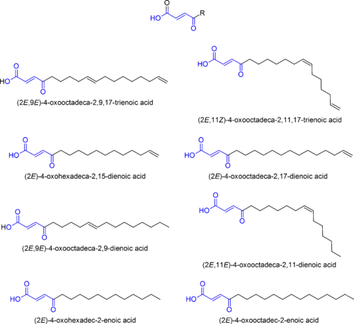- ↑ Eschen-Lippold L, Draeger T, Teichert A, Wessjohann L, Westermann B, Rosahl S, Arnold N (2009). "Antioomycete activity of gamma-Oxocrotonate fatty acids against P. infestans". Journal of Agricultural and Food Chemistry. 57 (20): 9607–12. doi:10.1021/jf902067k. PMID 19778058.