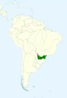 The helmeted woodpecker is found in the southern Brazilian states of São Paulo, Paraná, and Santa Catarina, and possibly formerly in Rio Grande do Sul. Its range also includes the eastern half of Paraguay and Misiones Province in far northeastern Argentina. The helmeted woodpecker is mostly found in large tracts of Atlantic Forest, both semi-deciduous and mixed deciduous-coniferous. It also occurs, but only rarely, in disturbed forest, plantations of introduced tree species, and small forest fragments. In elevation it ranges from sea level to about 1,000 m (3,300 ft).[8]